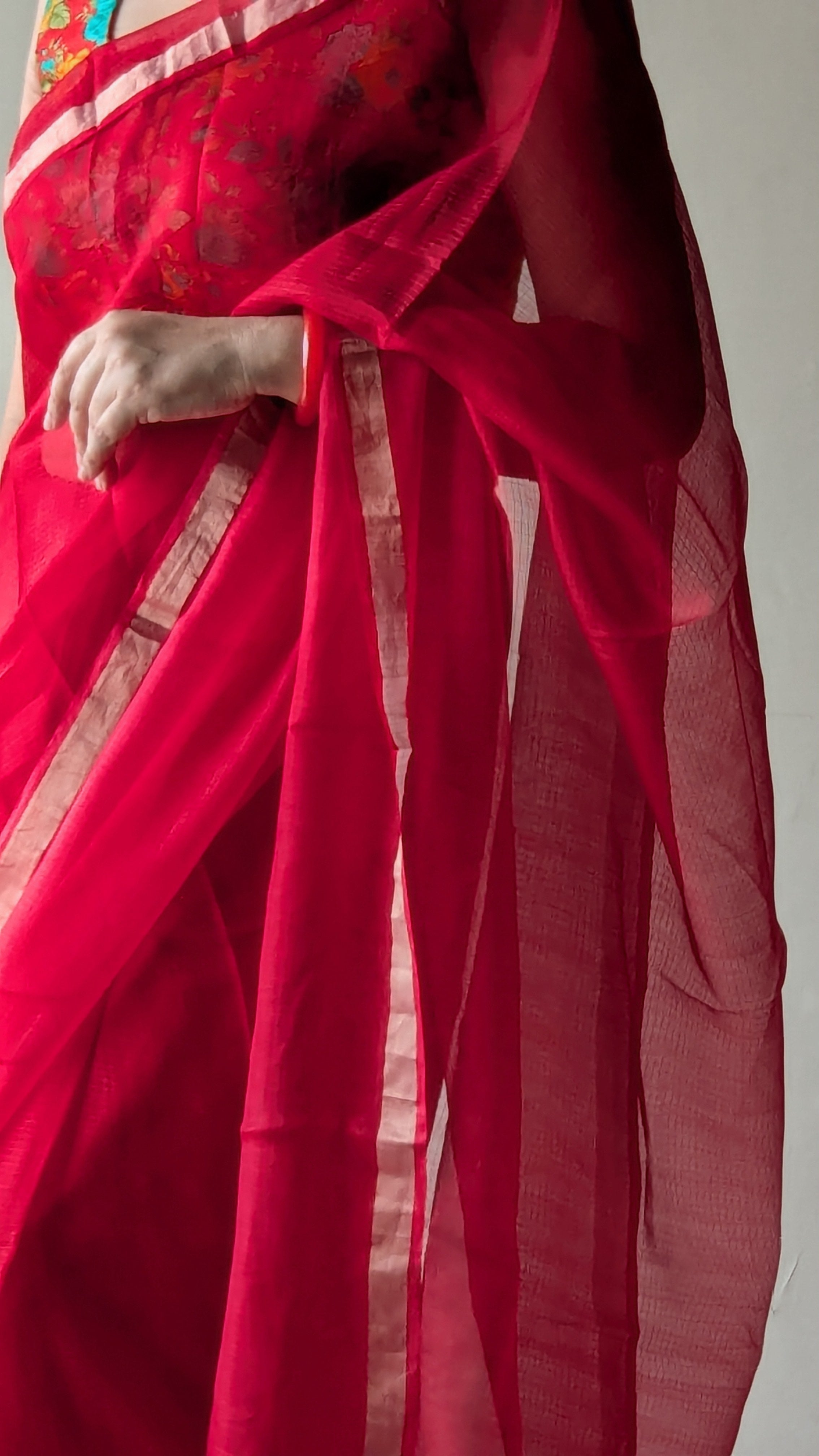 Where red reigns—the queen of colour, power, and love—this Kota silk drape flows with a gentle shade gradation.