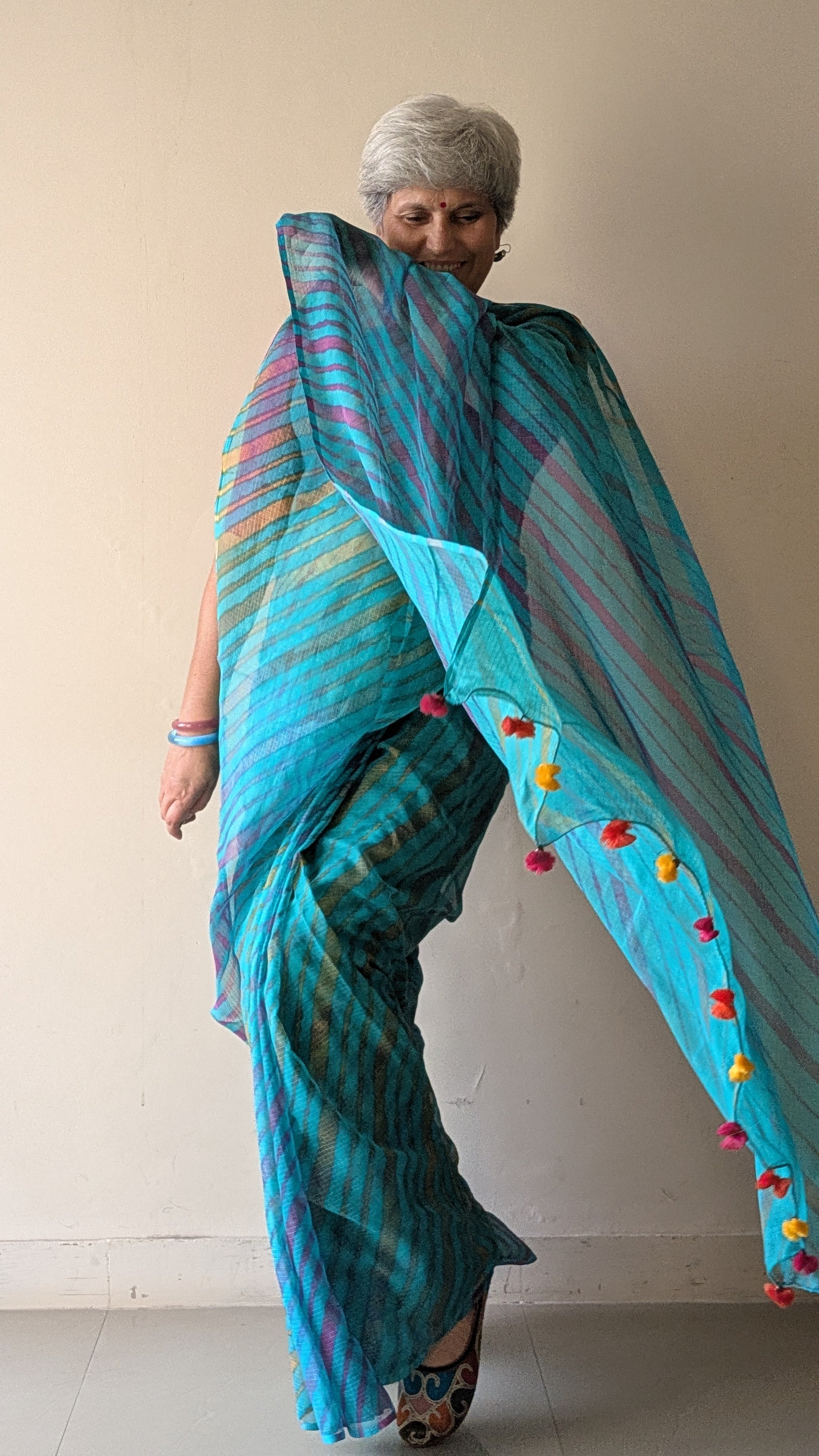 This is a high-quality Leheriya tie-dye Kota Doria cotton saree. The signature wavy designs have been crafted using the traditional Leheriya tie & dye method, through a time-honored process by skilled artisans from Rajasthan. Kota Doria is a blend of durable cotton and lustrous silk yarns, traditionally produced in the Kota district. The finely woven threads form delicate checkered patterns, giving it its unique lightweight and translucent texture that exudes both grace and elegance.