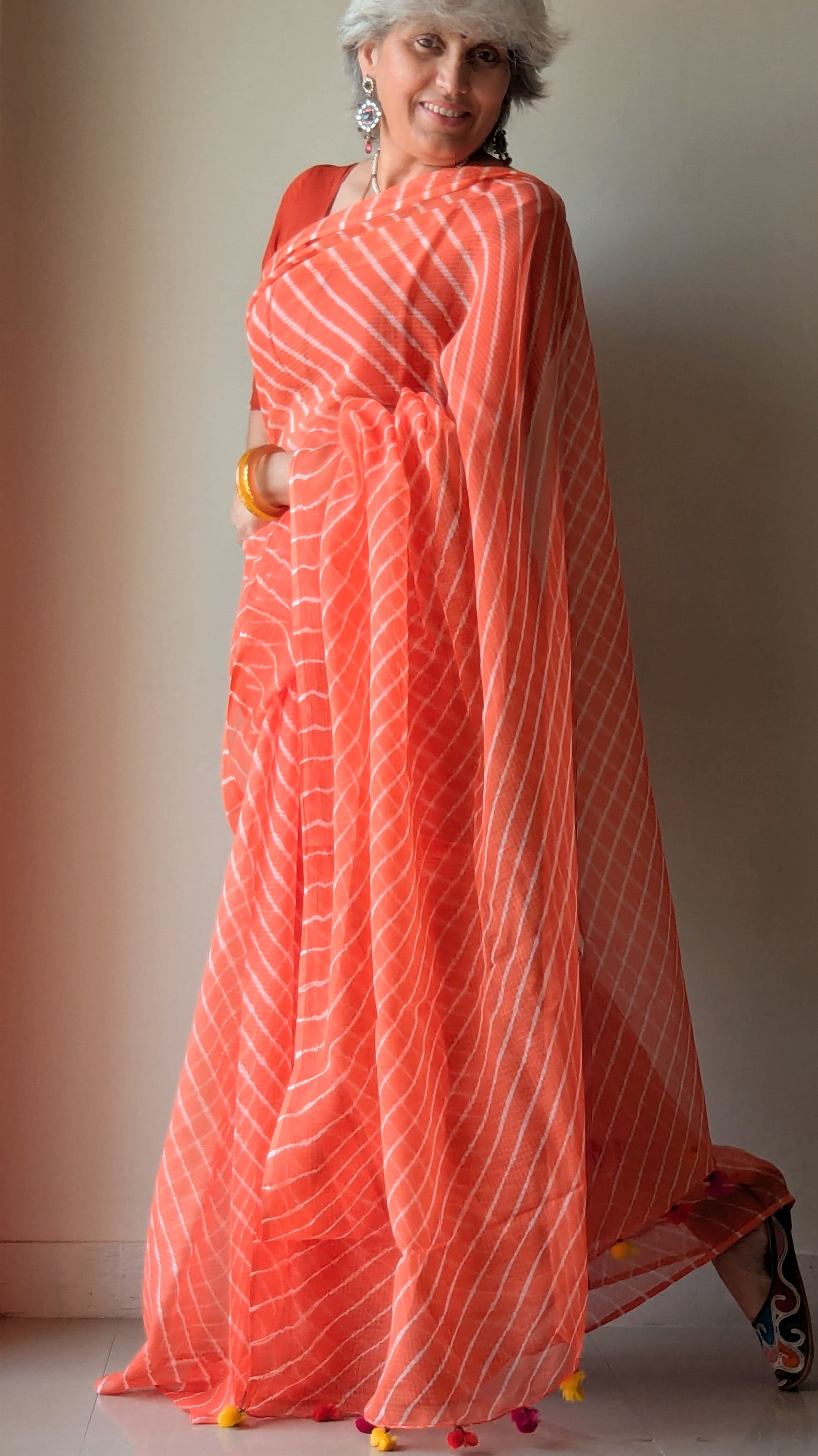 This is a high-quality Leheriya tie-dye Kota Doria cotton saree. The signature wavy designs have been crafted using the traditional Leheriya tie & dye method, through a time-honored process by skilled artisans from Rajasthan. Kota Doria is a blend of durable cotton and lustrous silk yarns, traditionally produced in the Kota district. The finely woven threads form delicate checkered patterns, giving it its unique lightweight and translucent texture that exudes both grace and elegance.