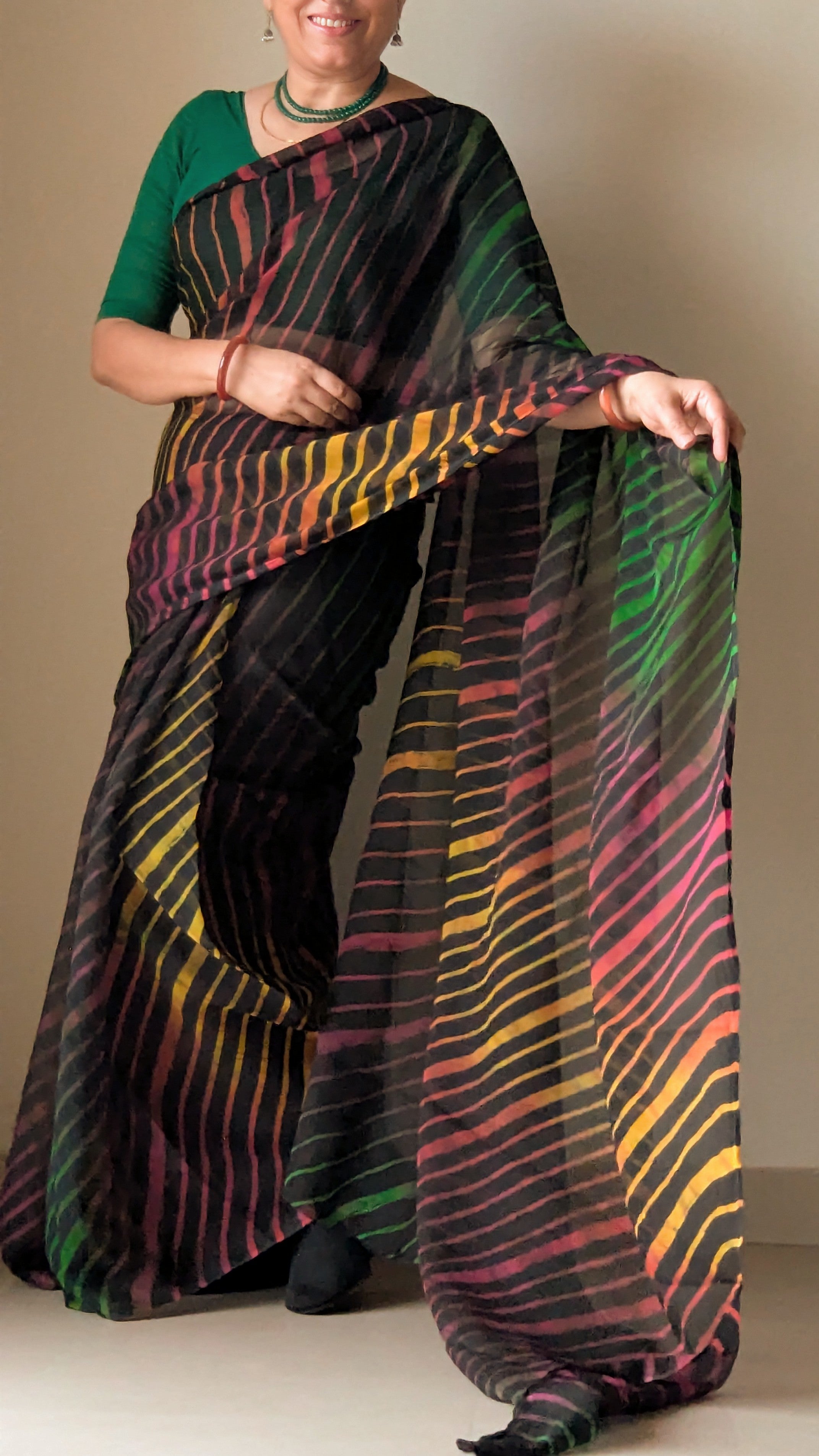 Handcrafted using the traditional Lehariya tie- dye technique.Ghata features a rich black chiffon base, streaked with waves of vibrant colours—reminiscent of sunlight breaking through dark rain clouds. The sheer, flowing chiffon fabric drapes like a gentle breeze, light and full of movement.
