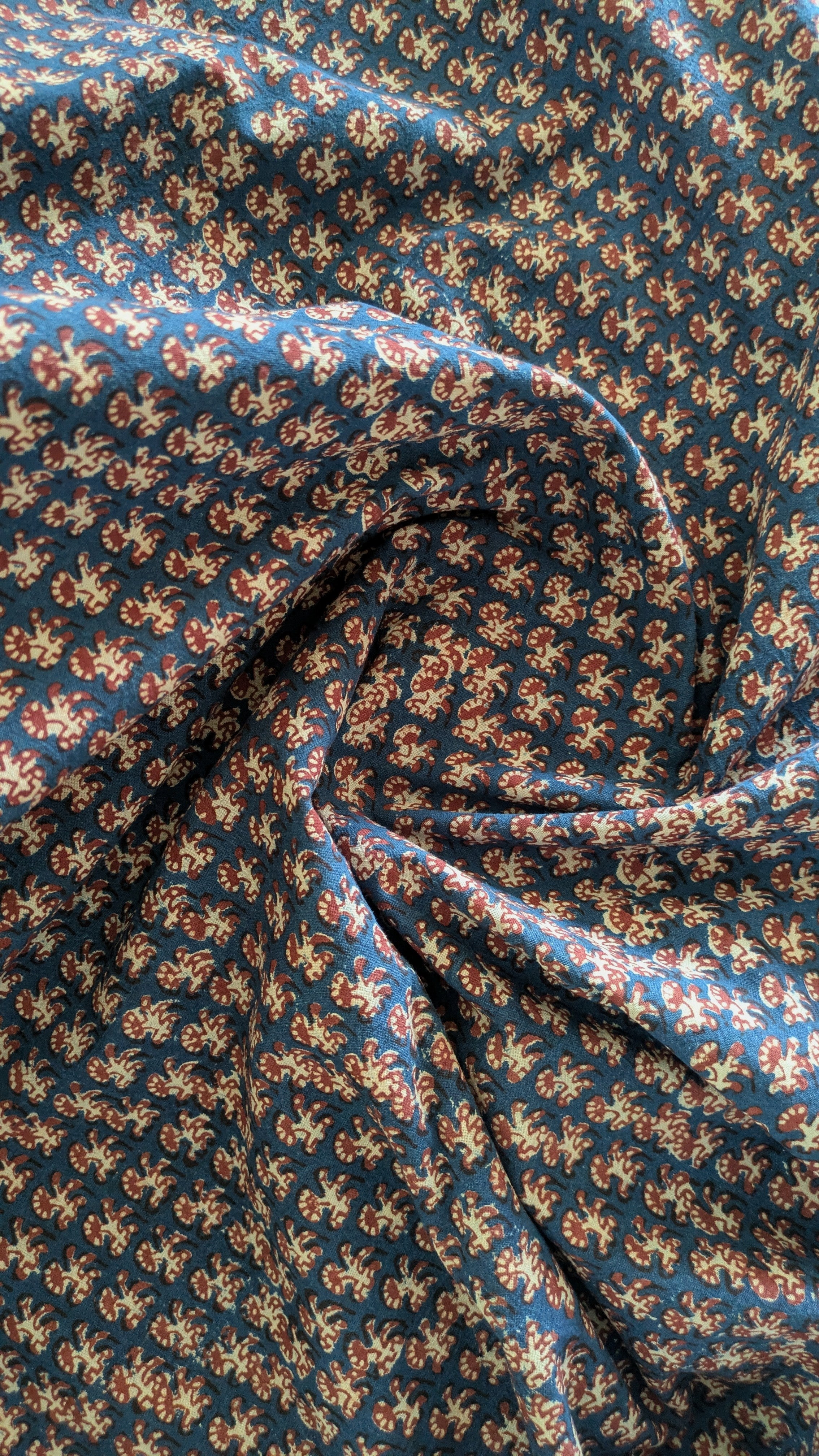 This exquisite Pharad Print yardage showcases the intricate craftsmanship of Bagru and Dabu printing techniques. Each design is painstakingly created with hand-carved, highly detailed wooden blocks, requiring immense skill and time. The fabric is dyed in natural indigo, resulting in a rich, deep hue that reflects both luxury and heritage. The Dabu resist-dyeing technique adds texture and depth, elevating this fabric as a true work of art.
