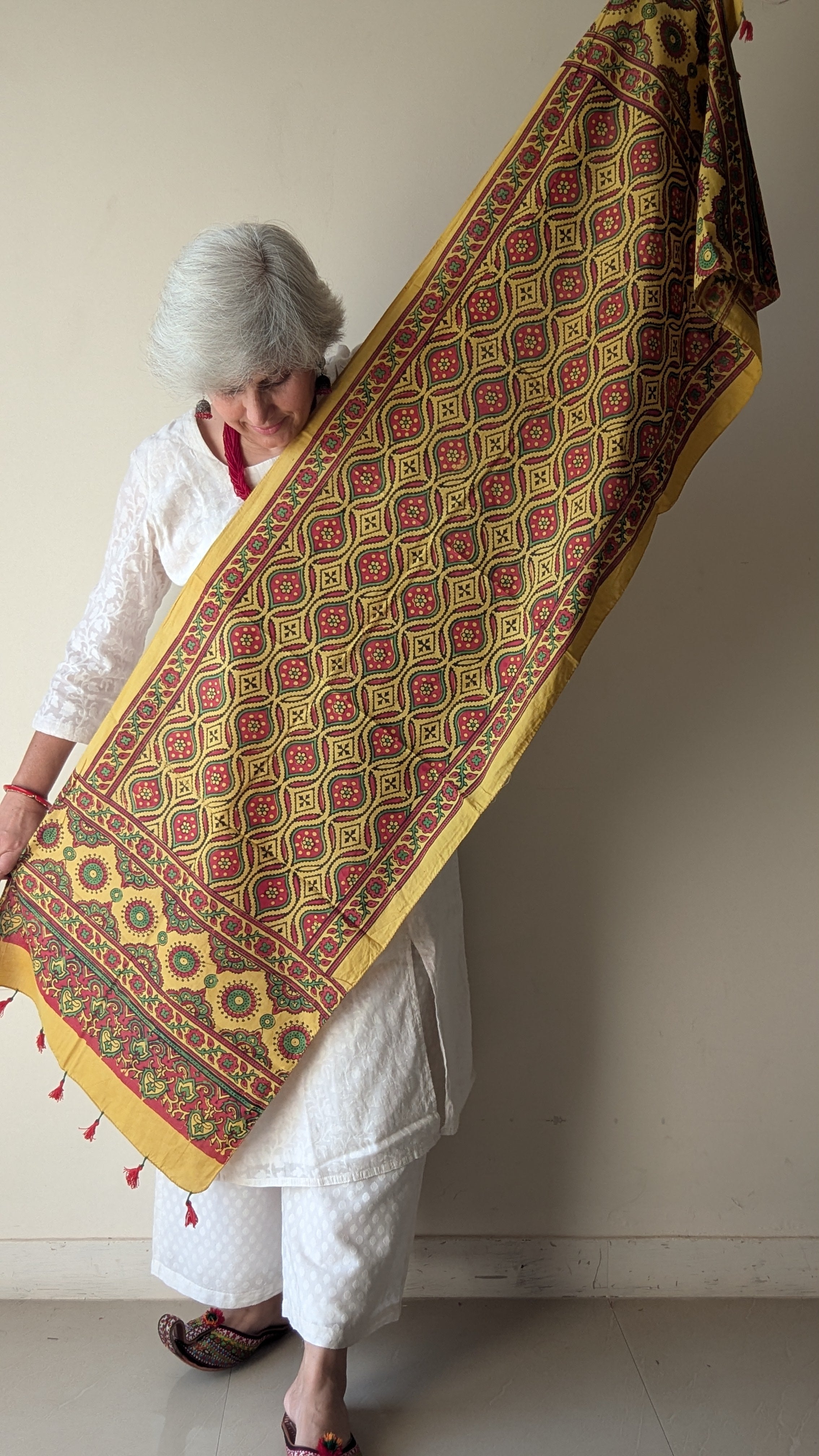 Handblock Ajrakh mul cotton stole crafted by master artisans from Barmer, Rajasthan. Soft, lightweight, and detailed with...