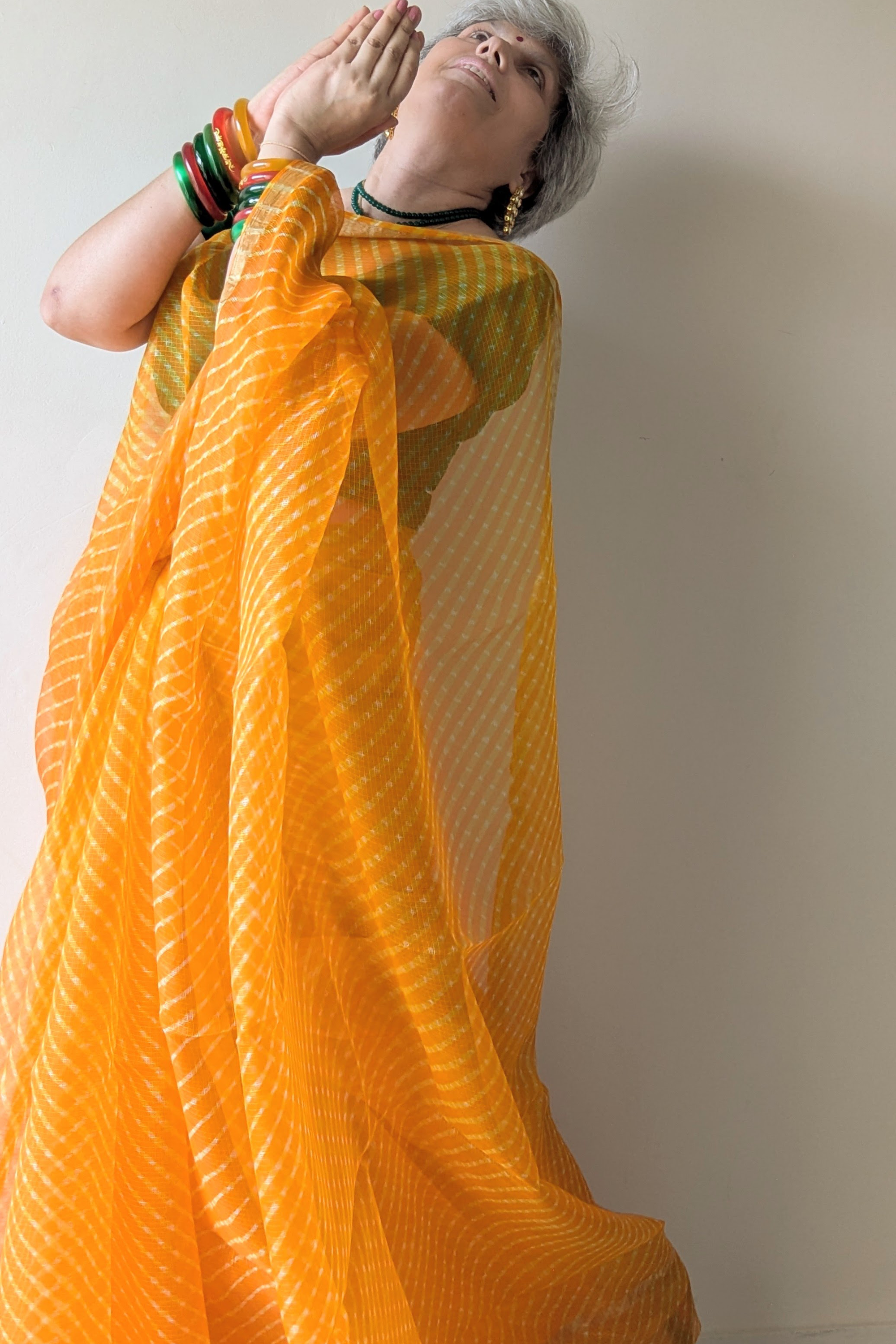 This saree is crafted from fine-quality Kota Doria silk, showcasing the traditional tie-dye technique of Lehariya. Originating from Rajasthan, Kota Doria combines the strength of cotton with the elegance of silk to create a delicate, lightweight fabric. The unique checkered texture, achieved through meticulous interweaving of threads, gives the saree a graceful and refined look.