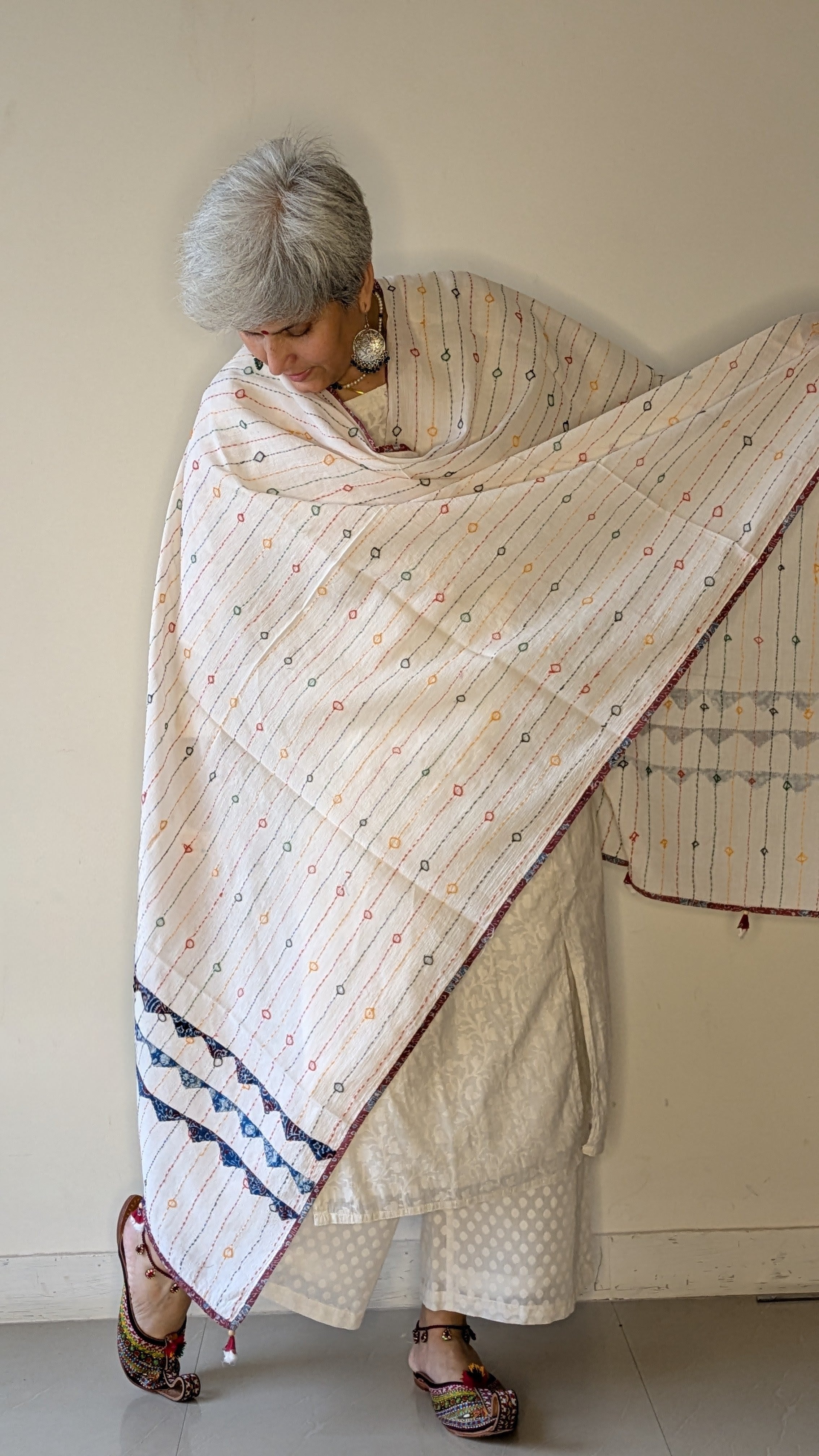 Crafted on soft off-white Mul Cotton, these dupattas feature intricate patchwork with animal motifs—each patch block printed and hand-stitched by women artisans of Barmer, Rajasthan.