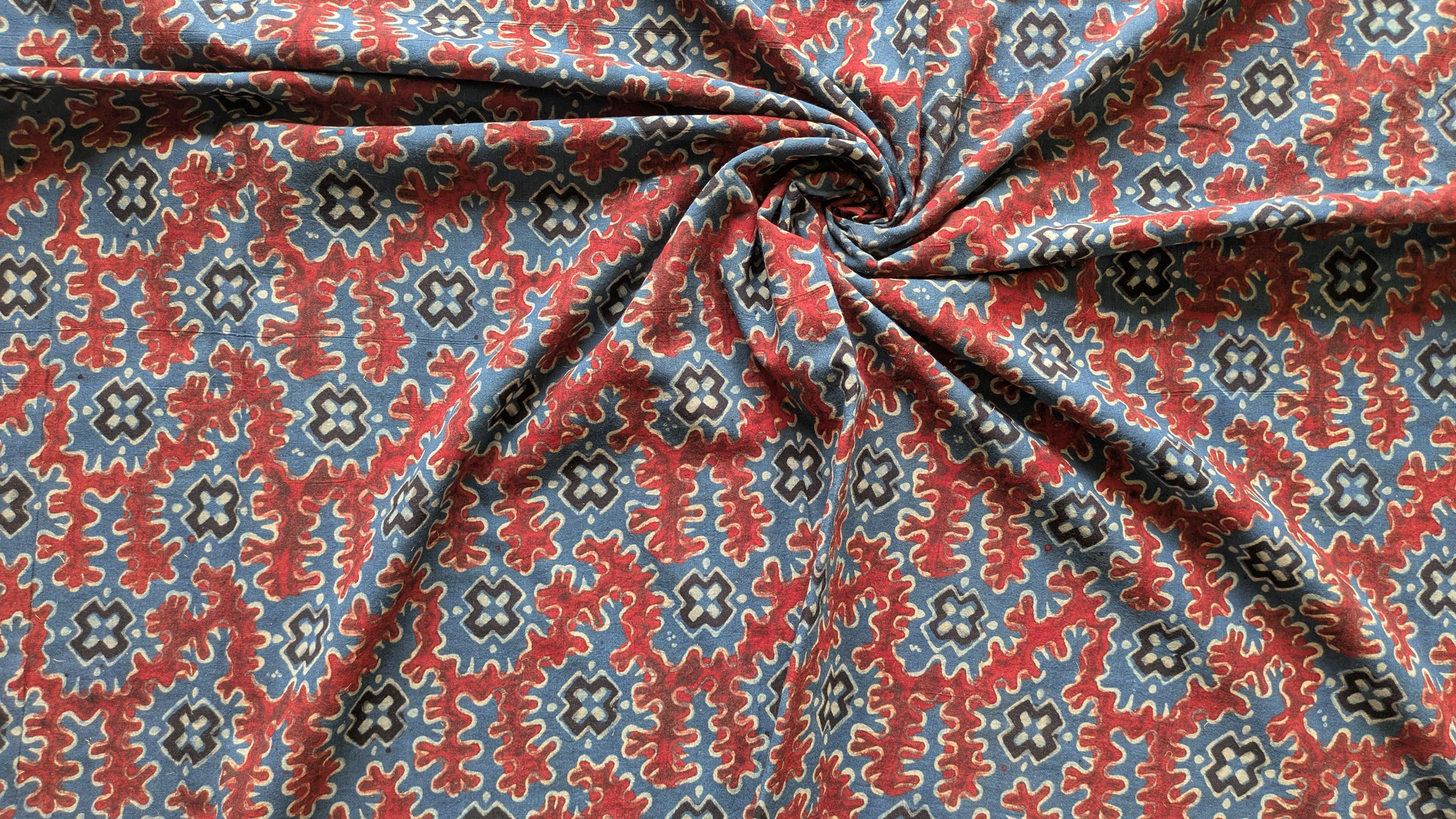 Handcrafted in the traditional Ajrakh style, this fabric is a beautiful dialogue between movement and symmetry — bold, rooted, and timeless