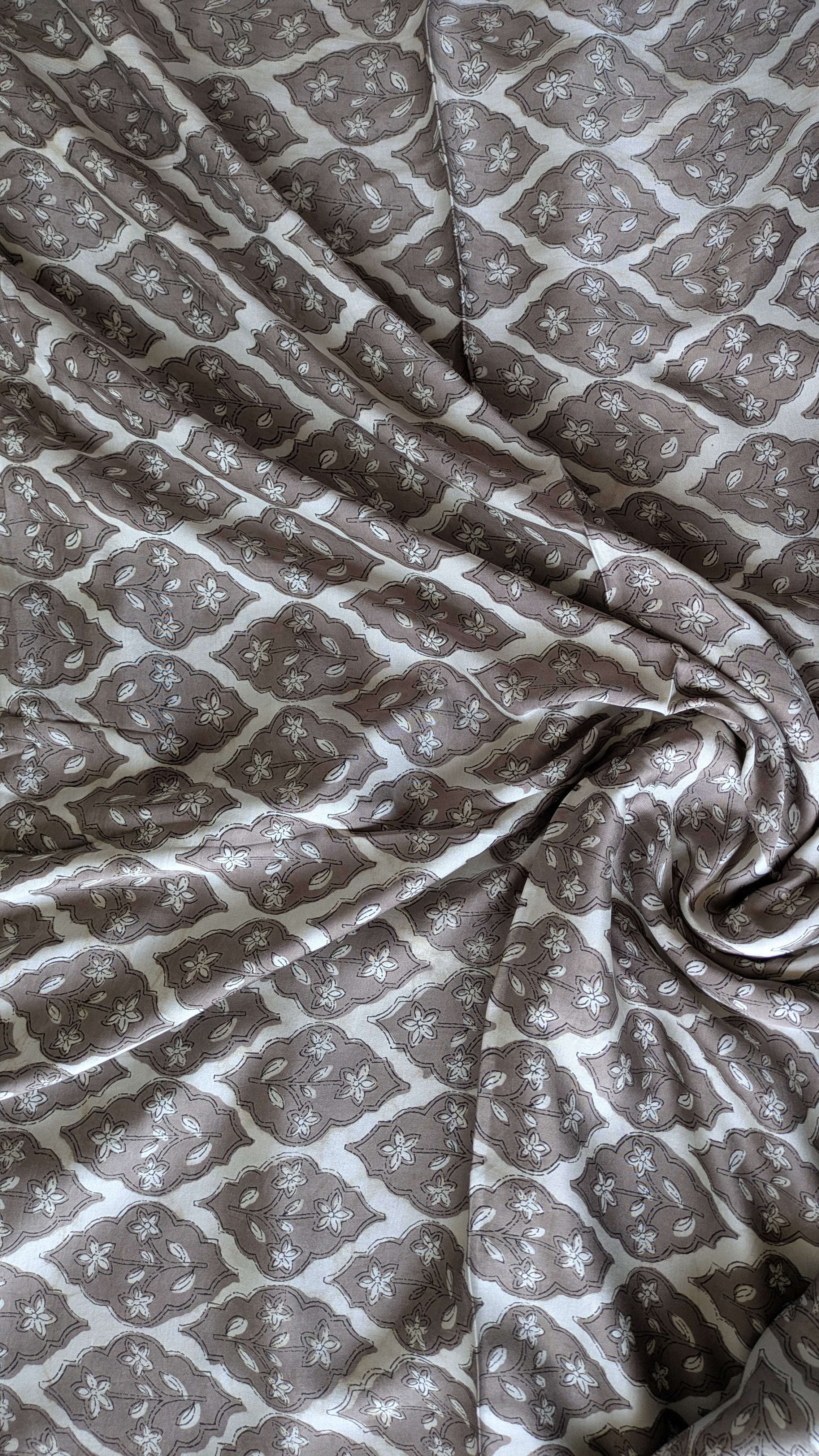 Soft, lustrous, and breathable, Misty Mahal is crafted from premium Modal Silk, offering effortless elegance with a gentle sheen and fluid drape. The fabric features delicate Vanaspati hand block prints with intricate floral motifs in muted greyish taupe on a soft ivory base.