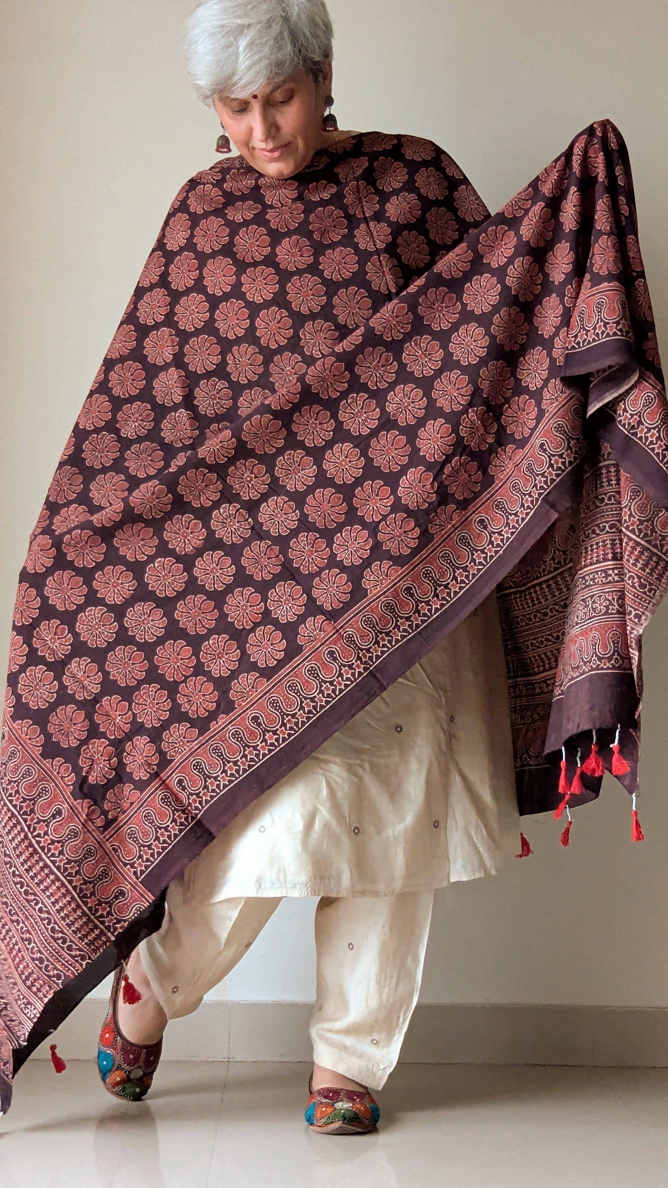 Nomad Tale carries the story of wandering traditions and timeless artistry. Handcrafted in Barmer, Rajasthan, this Ajrakh dupatta is made using natural dyes and traditional hand block printing techniques. The deep brown mul cotton base is adorned with symmetrical floral motifs in warm rust tones, printed with precision by skilled artisans. Intricately patterned borders featuring paisleys, waves, and star-like forms frame the piece beautifully.