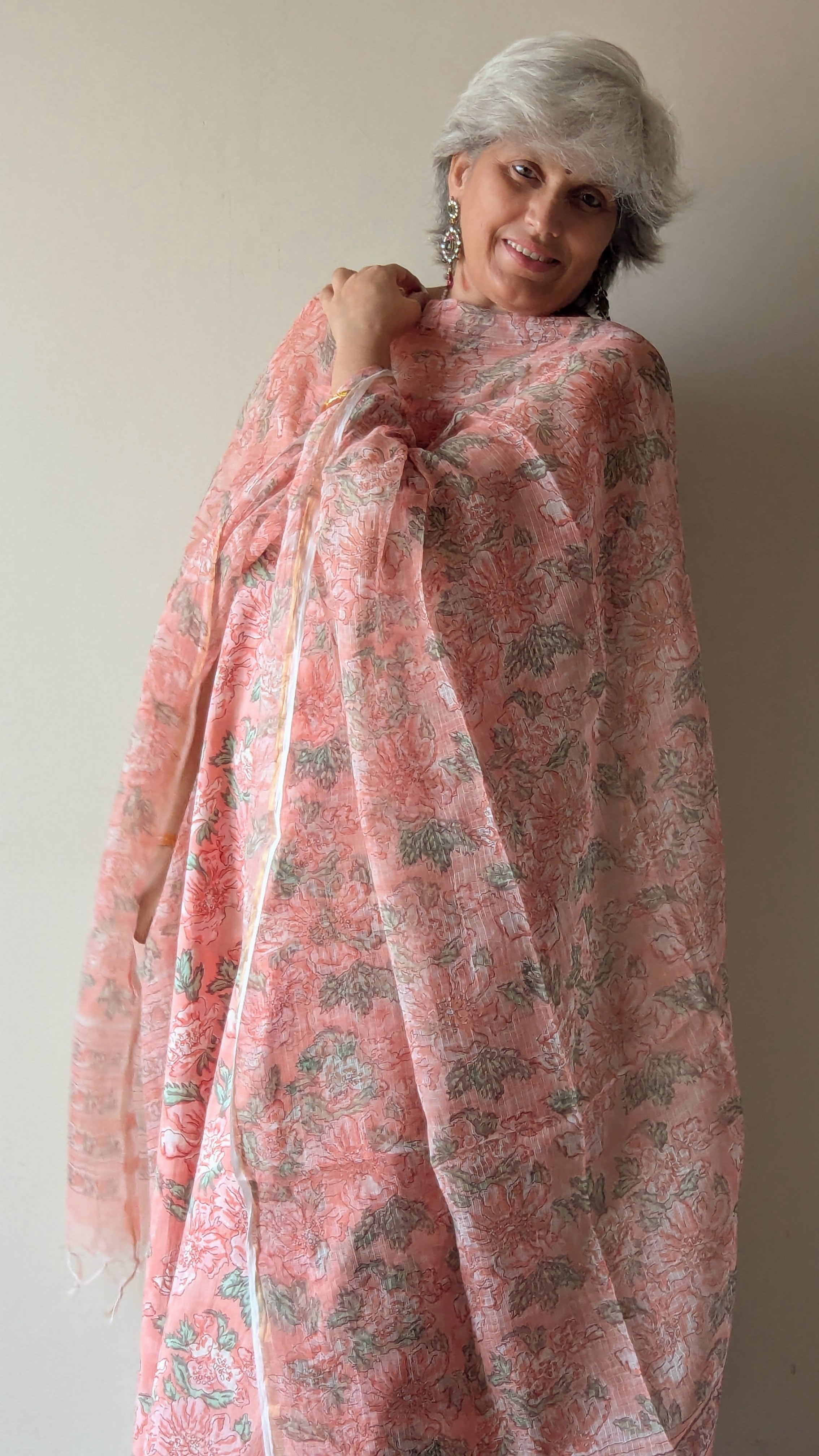 Soothing peach florals come alive in this unstitched cotton suit paired with a soft cotton Kota Doria dupatta.
