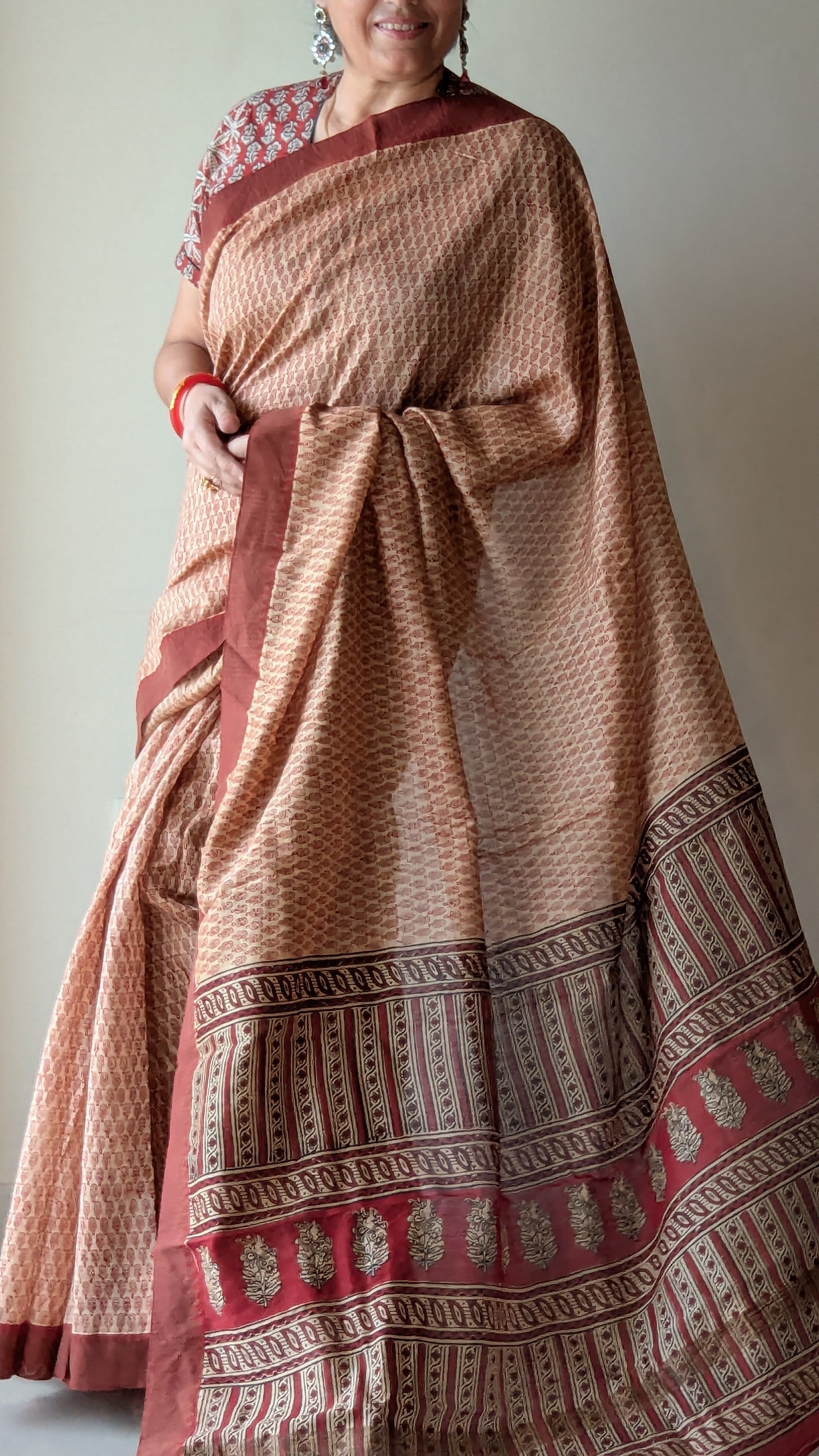 Crafted using the traditional Bagru Syahi Begar technique, this saree features Phadad prints known for their intricate, small-scale designs. These delicate floral and geometric motifs, created with finely carved wooden blocks, exemplify the precision and artistry of Rajasthan's hand-block printing heritage.