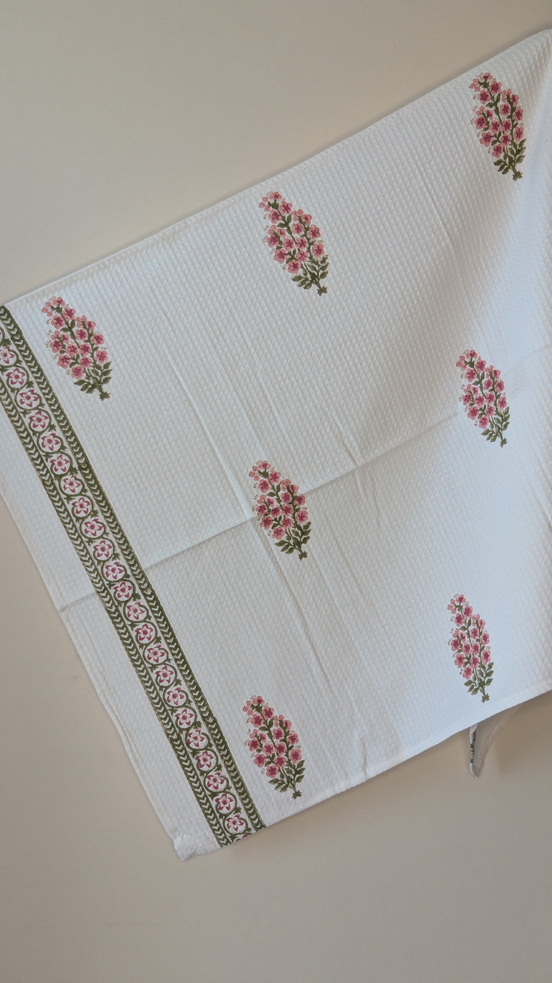 A gentle embrace in the form of a towel. Crafted from soft honeycomb cotton waffle, it carries the charm of hand block printing and the quiet elegance of a green vine side edges.