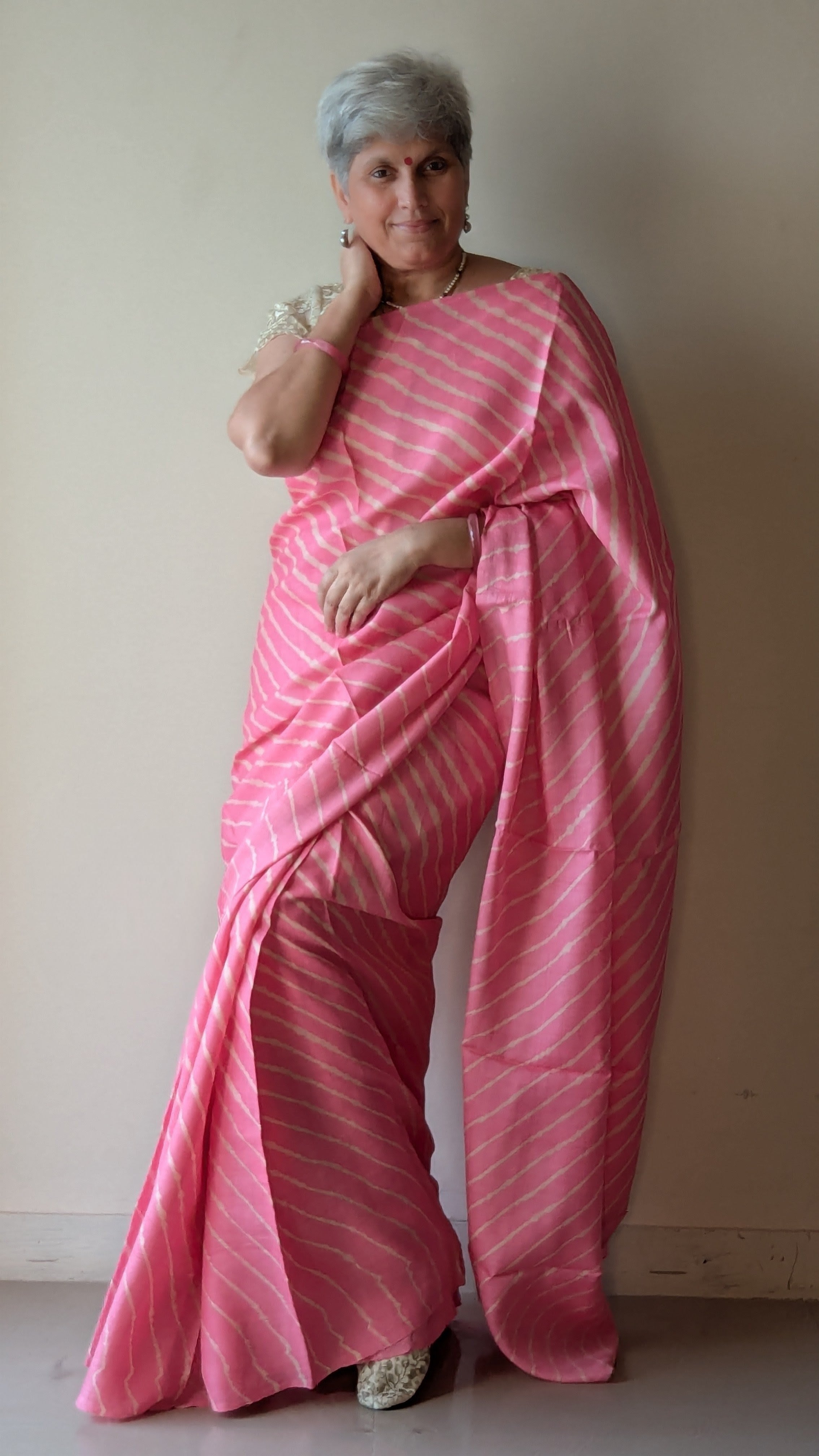 This is a premium Leheriya tie-dye pure Tussar silk handloom saree. The signature wavy patterns have been carefully dyed using the traditional Leheriya tie & dye technique, crafted through an age-old process by expert artisans from Rajasthan. Tussar silk is celebrated for its distinctive texture, combining the elegance of silk with the softness of cotton. This exquisite collection of Leheriya Tussar silk sarees highlights intricate handwoven designs.
