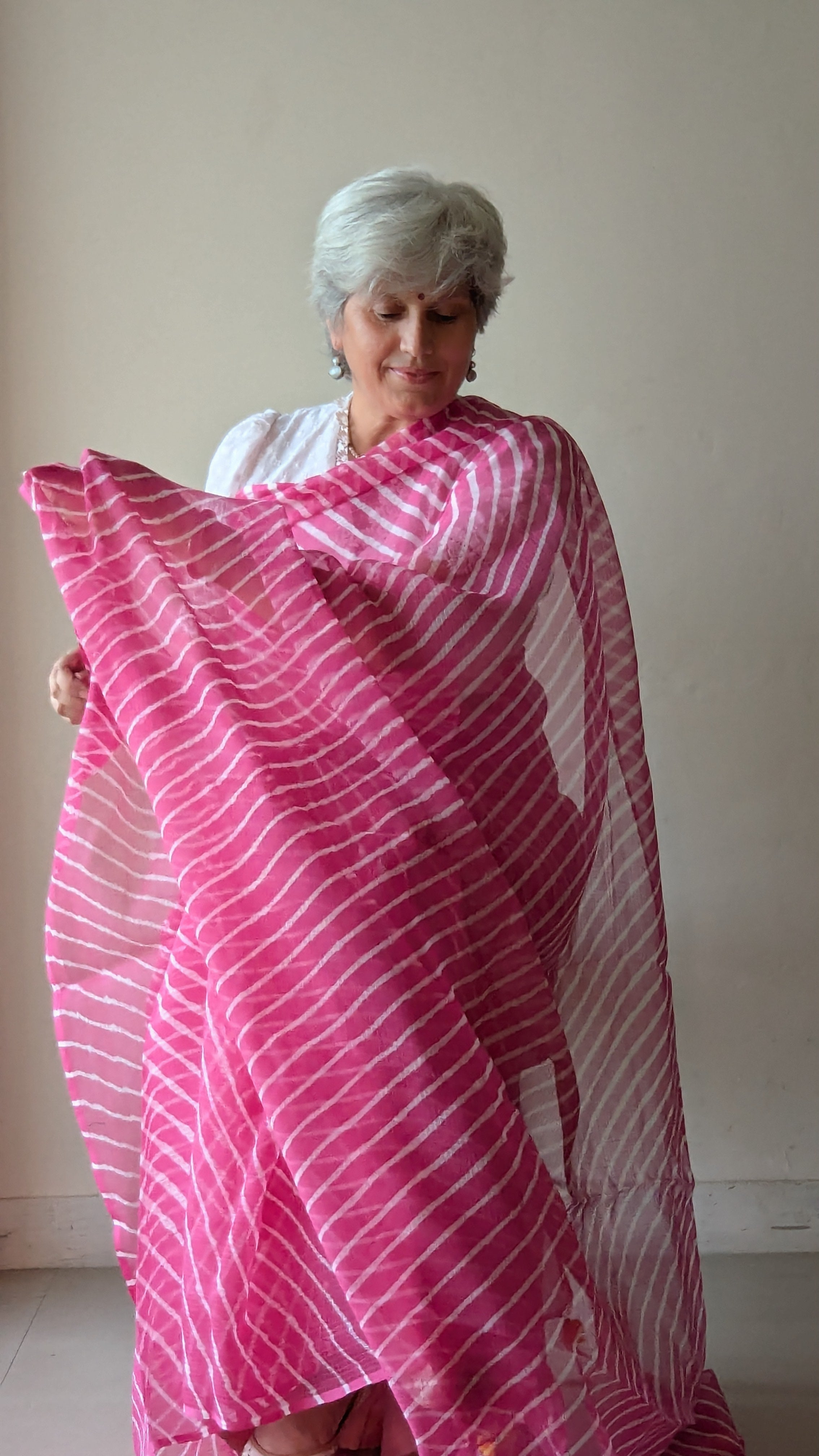 This is a high-quality Leheriya tie-dye Kota Doria cotton saree. The signature wavy designs have been crafted using the traditional Leheriya tie & dye method, through a time-honored process by skilled artisans from Rajasthan. Kota Doria is a blend of durable cotton and lustrous silk yarns, traditionally produced in the Kota district. The finely woven threads form delicate checkered patterns, giving it its unique lightweight and translucent texture that exudes both grace and elegance.