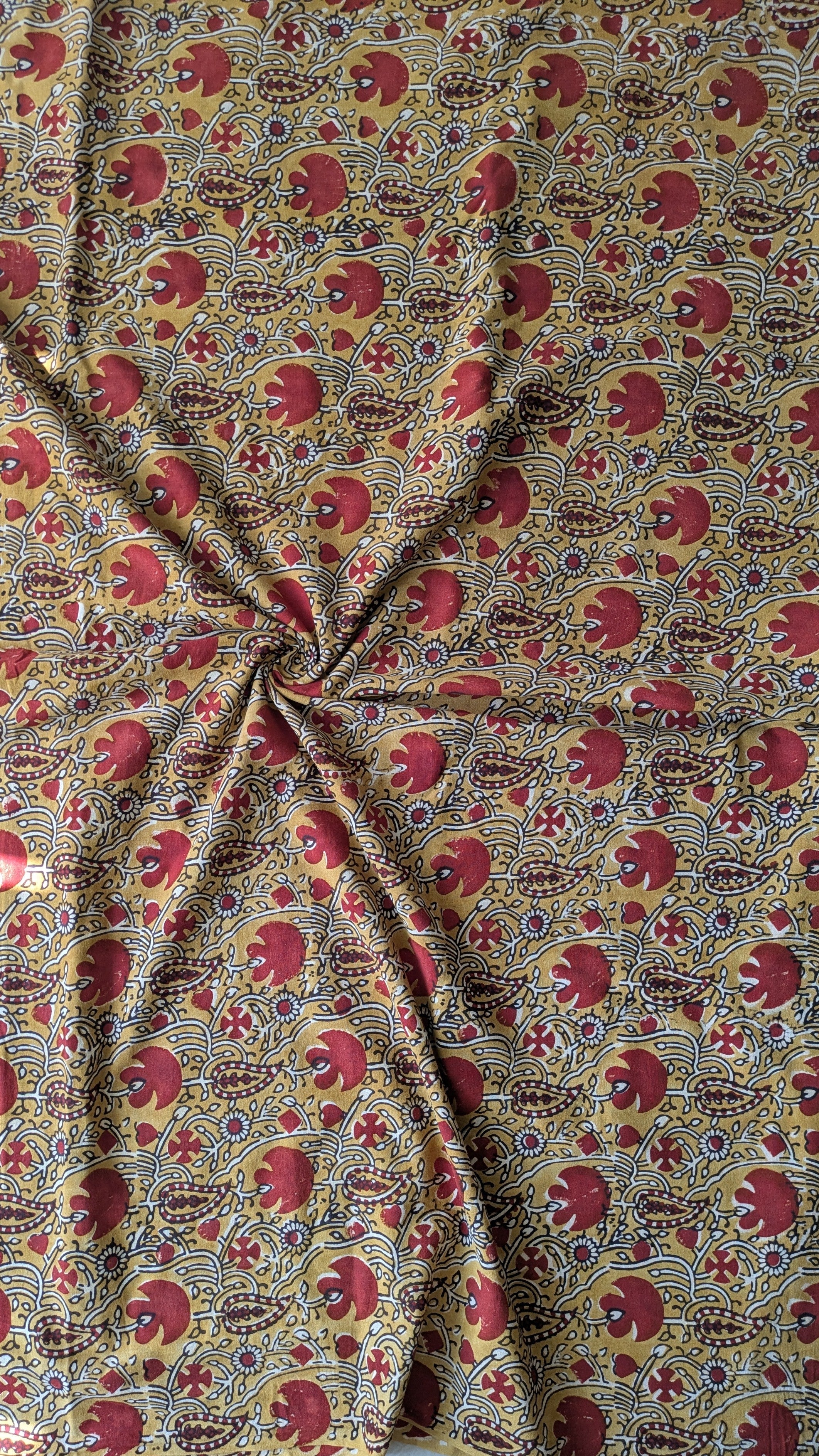 Shubh features traditional Ajrakh floral and paisley motifs in madder red on a mustard base, symbolizing warmth and positivity.