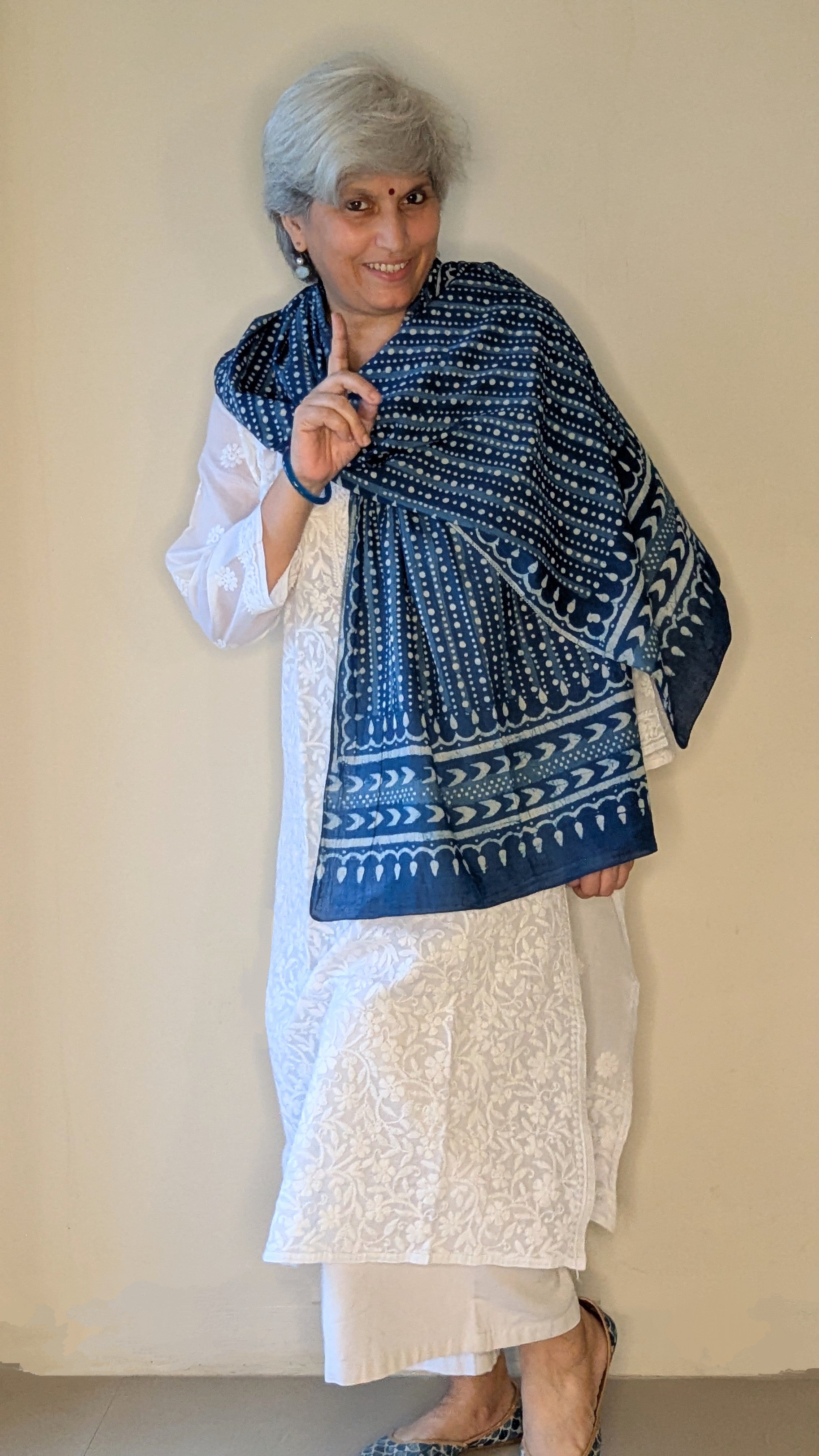 A classic piece in timeless indigo, Skydots features delicate dotted patterns created using the traditional Dabu hand block printing technique. Dyed naturally in indigo, this stole carries the charm of handcrafted artistry and everyday elegance.
