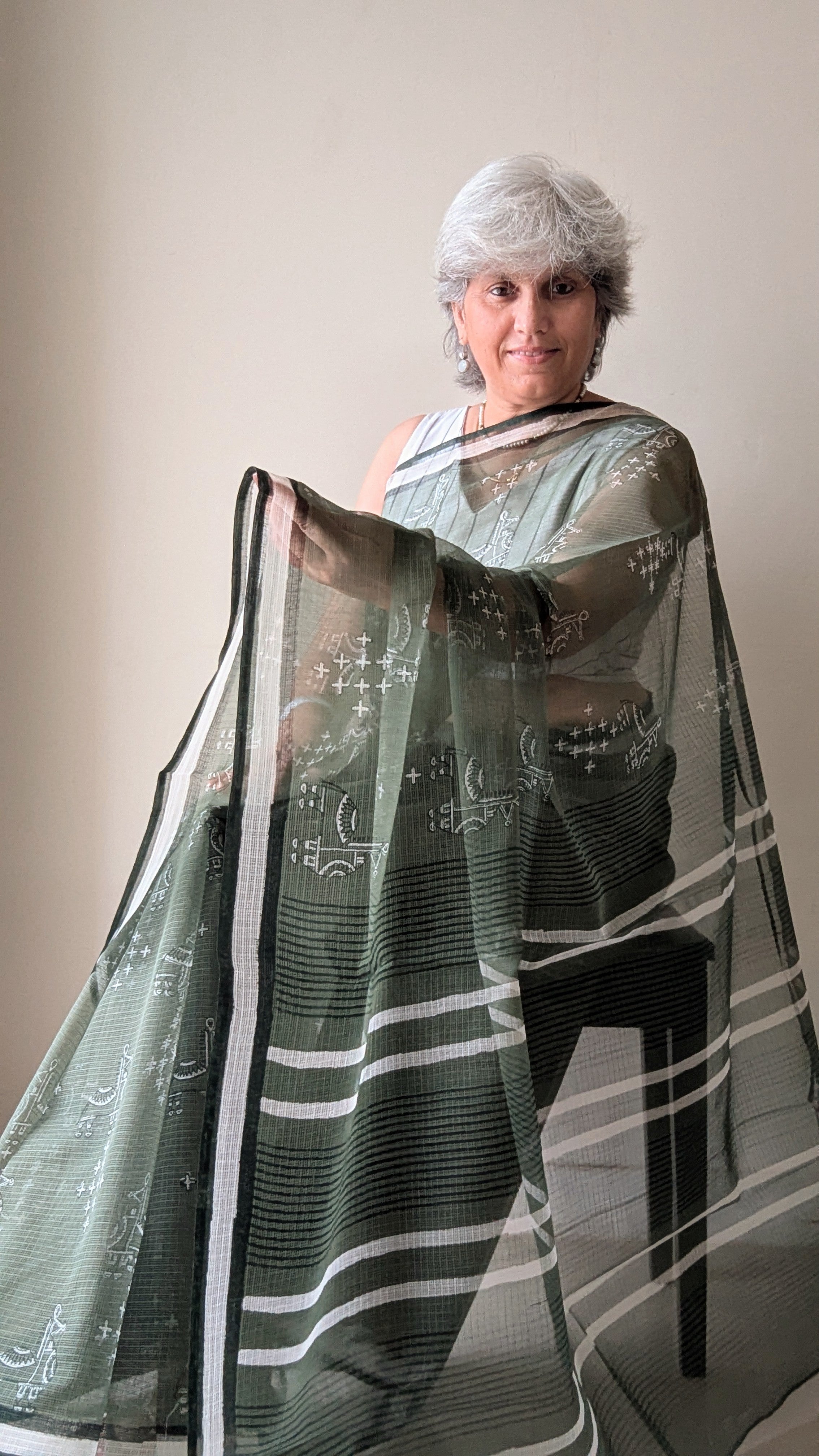A graceful dusty sage green saree in cotton Kota Doria – light, breathable, and elegant. Adorned with folk-art horse motifs, handblock printed in white using traditional techniques.