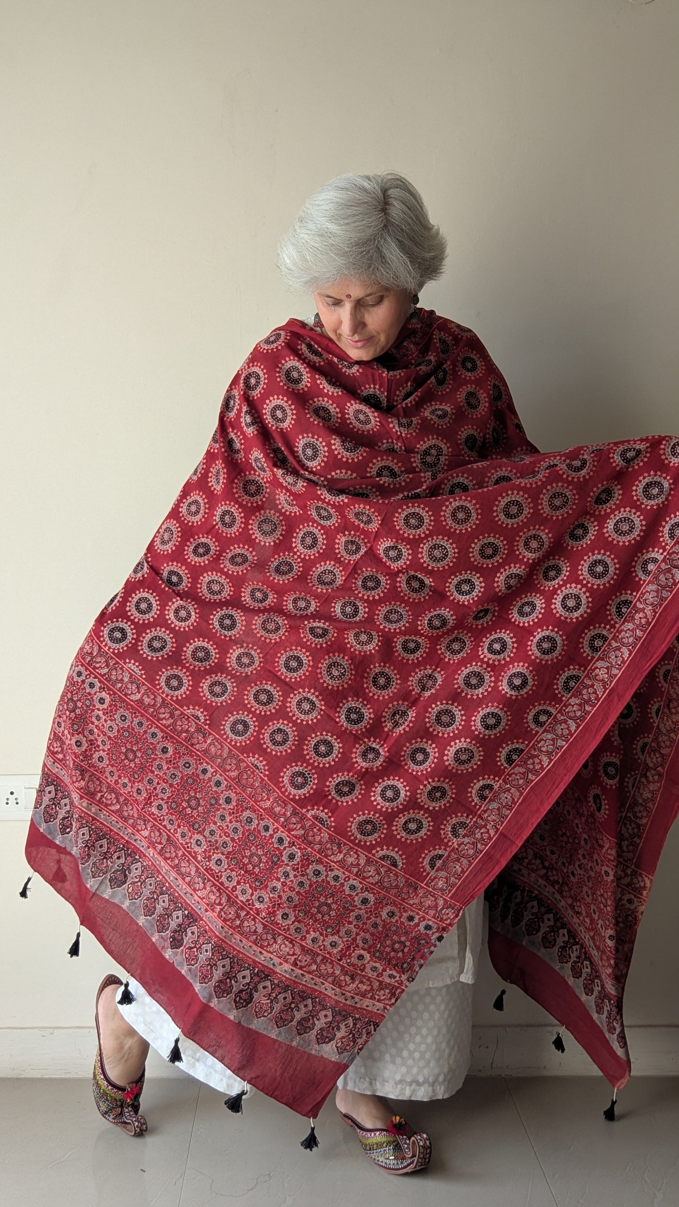 Handcrafted in Rajasthan, Ajrakh dupattas are created using centuries-old block printing traditions. Printed with natural dyes like indigo, madder, and iron, each piece carries layered depth and intricate motifs—stars, paisleys, and florals—precisely aligned by skilled artisans. Soft, breathable cotton fabric makes them versatile wraps, finished with handmade details such as tasselled edges.