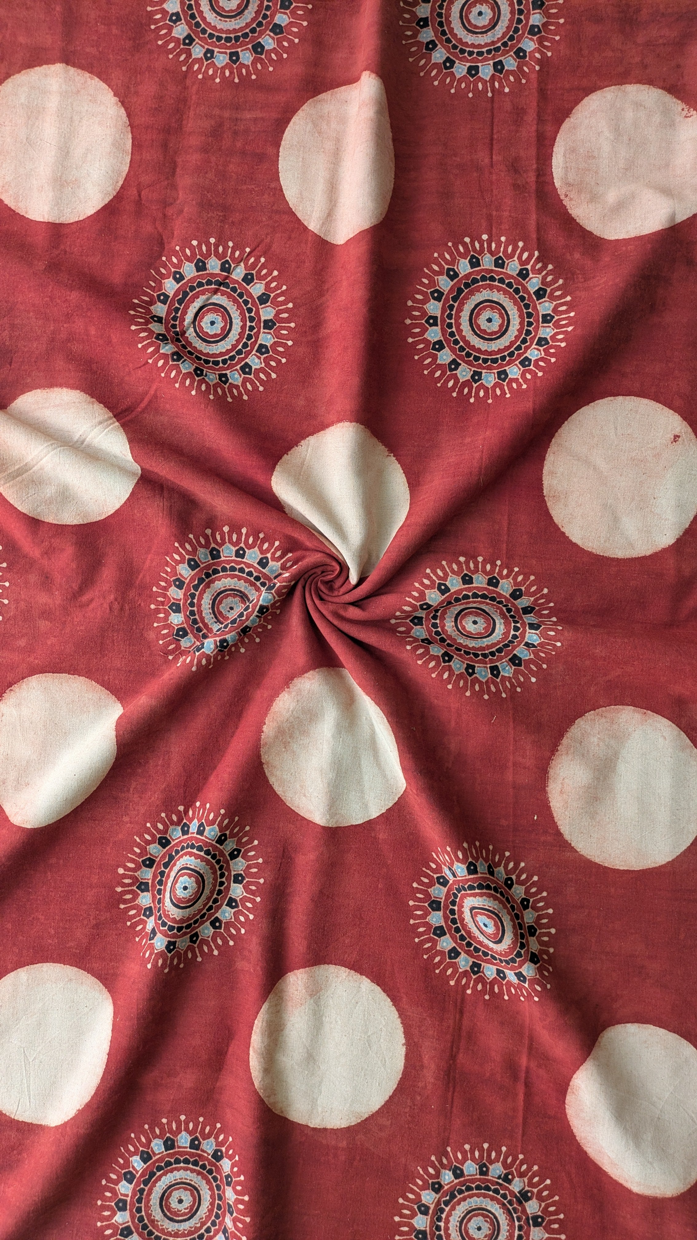 The fabric features alternating circular motifs: some appear as pure white moons, others as intricately detailed sun mandalas, all resting on a madder red base.